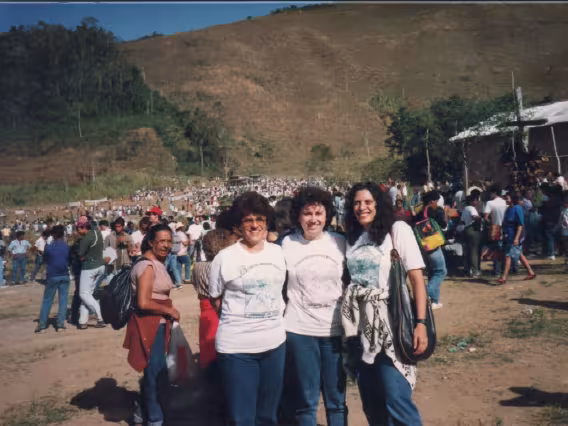 Reunião na casa da profa. Vera Candau (EDU) pelo aniversário da profa. Ana Waleska (EDU), que aparece ao lado da profa. Lúcia Helena Saavedra (PSI).