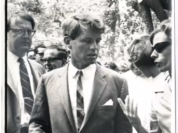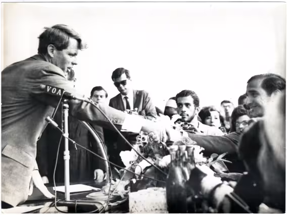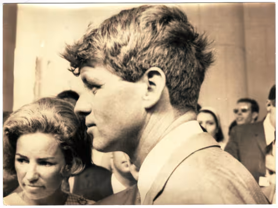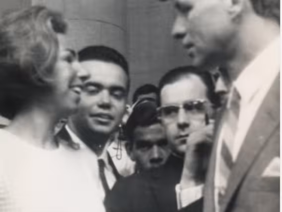O senador Robert (Bob) Kennedy nainauguração do busto de seu irmão, John Kennedy, nos pilotis do Edifício da Amizade. Ao lado, o Cardeal DOm Sebastiano Baggio e o reitor pe. Laércio S.J..