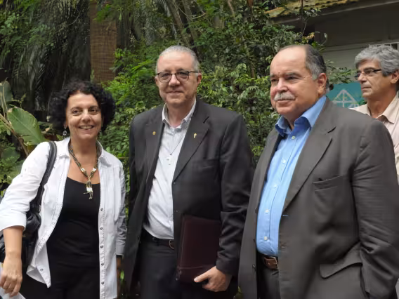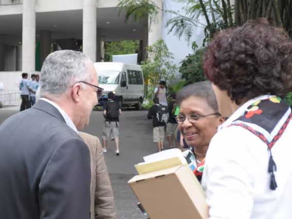 Professor e Reitor Josafá Carlos de Siqueira S.J., Luiza Bairros (Geledés) e Professora Sonia Maria Giacomini conversam durante o evento.