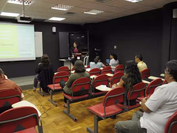 Código exclusivo yg0032_009 Coleção VIII POSCOM - Seminário dos Alunos do Programa de Pós-Graduação em Comunicação da PUC-Rio Data de criação 23/11/2011 Natureza do documento imagem Tipo de documento fotografia cor Descrição Palestrante e a plateia do seminário.