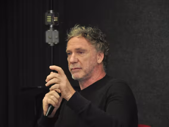 O professor Sergio Mota, do Departamento de Comunicação mediando o bate-papo com Oskar Metsavaht, fundador e diretor de criação e estilo da Osklen e presidente do Instituto - e.