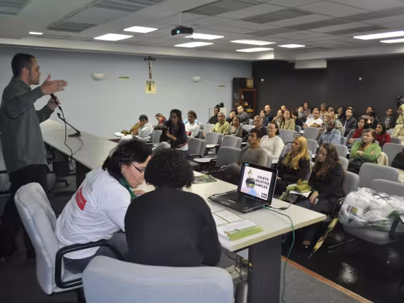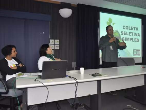 Representante da Companhia Municipal de Limpeza Urbana em palestra para funcionários.