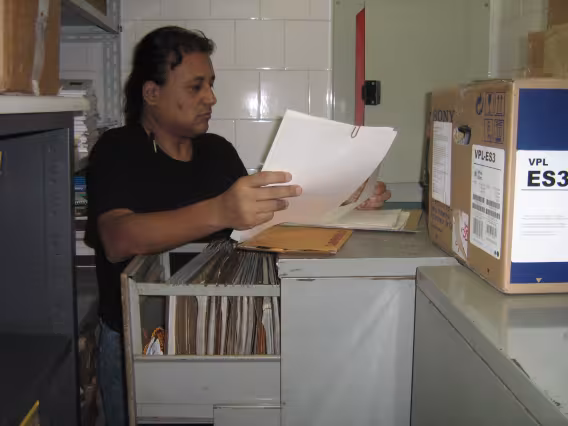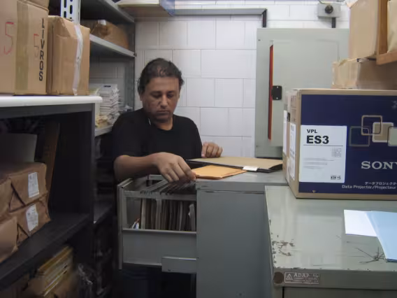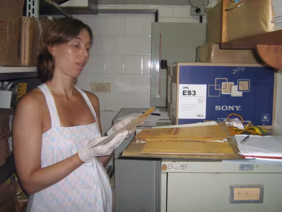 Pesquisadora no local do acervo, na época sala da reprografia.