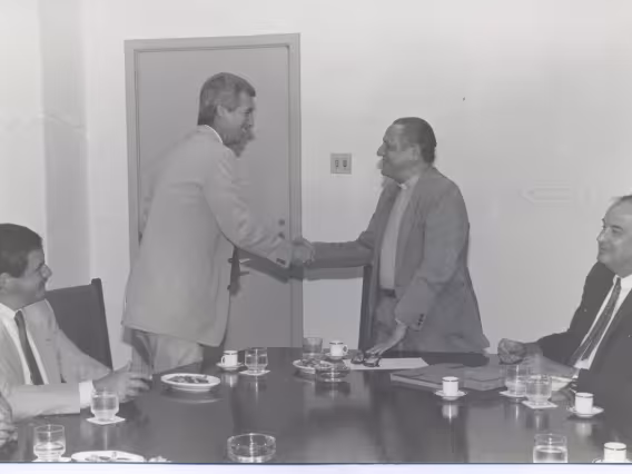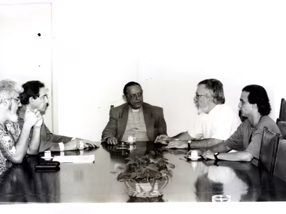O Reitor Padre Laércio Dias de Moura S.J. e o Diretor de Marketing da IBM, Júlio Alvarenga, à direita, assinam um convênio para a criação do curso de extensão Gestão de artes e tecnologia multimídia. Segundo matéria do Jornal da PUC, o curso foi o primeiro a abordar a multimídia na América Latina.