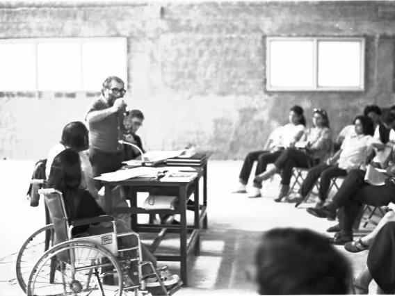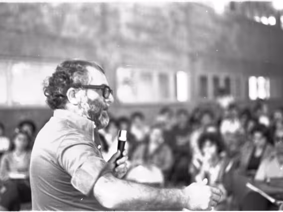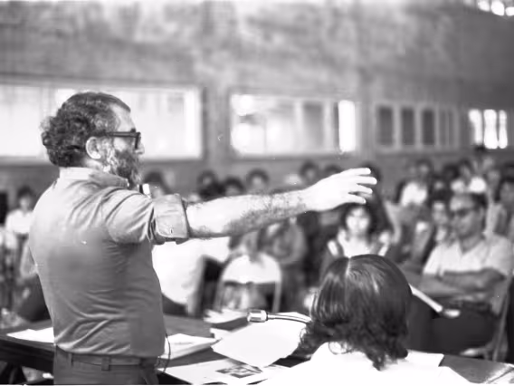 Palestra do Movimento Universidade à Serviço do Povo (MUSP) sobre sua atuação nas favelas do Rio de Janeiro. Realizada no espaço, ainda em obras, onde hoje é o Auditório Padre Anchieta.