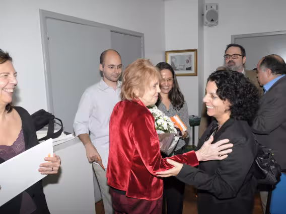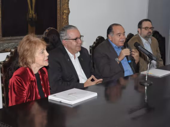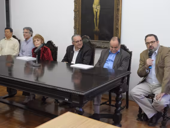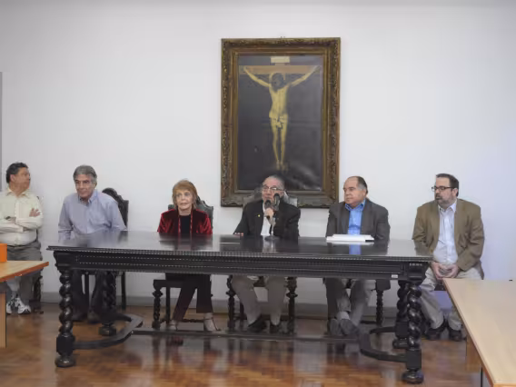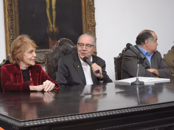 Mesa com palestrantes e plateia presente no evento.