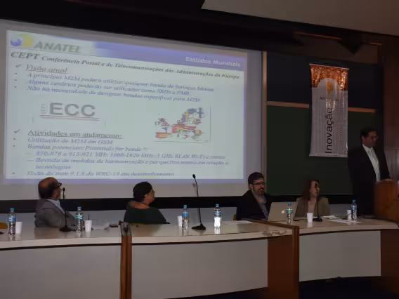 Código exclusivo rl0011_007 Coleção Encontro da Agência PUC-Rio de Inovação (AGI) Data de criação 15/12/2016 Natureza do documento imagem Tipo de documento fotografia Descrição Mesa com palestrantes observam a apresentação do representante da Anatel.