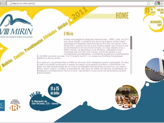 A homepage do MIRIN VIII, evento do Instituto de Realações Internacionais, realizado em julho de 2011, na PUC-Rio