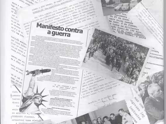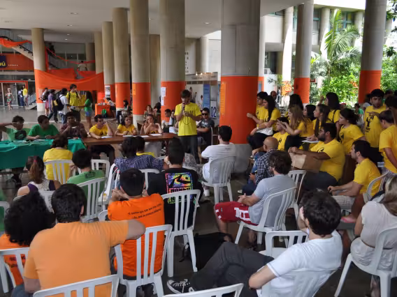 Debate das chapas concorrentes ao CACOS. Presentes alunos do curso de Comunicação Social e alguns de outros cursos. Debate mediado por um membro do DCE. Colados nos pilotis, cartazes de uma chapa concorrente ao CA de Administração (em verde) e de uma chapa concorrente ao CA de Direito (em laranja).