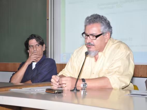 O reitor Padre Josafá fala na cerimônia de assinatura do convênio de apoio à Agenda Ambiental PUC-Rio e Santander Universidades. À mesa, além dos representantes da PUC-Rio, estão Jamil Hannouche, vice-presidente, e Afrânio Pereira, superintendete do Grupo Santander Universidades.