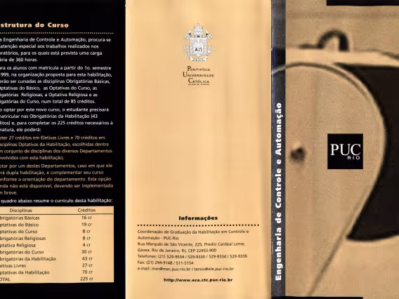 Apresentação do Curso de Engenharia de Controle e Automação. Opções (habilitações). Corpo docente e infraestrutura. Trabalhos em desenvolvimento. Foto de um pequeno braço robótico. "Sua implantação é um esforço conjunto dos Departamentos de [engenharia] Elétrica [...], Mecânica [...], Química [...] e Ciências dos Materiais".