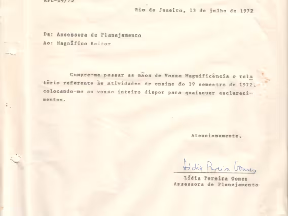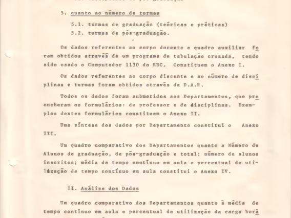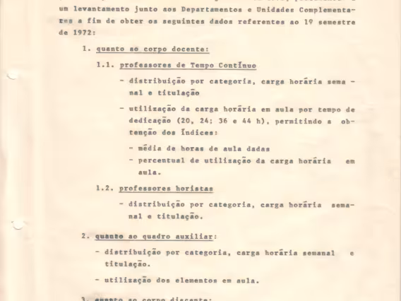 Relatório 09/72 referente às atividades de ensino do primeiro semestre de 1972 na PUC-Rio. O documento traz informações do corpo docente, da produtividade de ensino por Centro, da titulação dos professores, do número de disciplinas e turmas oferecidas, e do número de alunos por centro e por curso. O relatório traz no Anexo III dados do corpo docente, do número de disciplinas e de turmas dos departamentos de Educação, Filosofia, Letras, Psicologia, Teologia, Ciências Jurídicas, Comunicação Social, Economia, História, Geografia, Serviço Social, Sociologia, Física, Informática, Matemática, Química, Engenharia de Metalurgia, Engenharia Civil, Engenharia Elétrica, Engenharia Mecânica, Engenharia Industrial e do CETUC. Há ainda os anexos IV, um quadro comparativo com informações do número de alunos e de aulas por curso, e o V com dados da média de aulas por Centro e por departamentos.