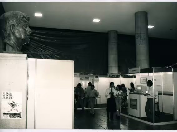 Estandes da exposição INFOPUC 95 organizada pelo Diretório Acadêmico do Projeto 15 (P15) do Curso de Tecnologia em Processamento de Dados da PUC-Rio.