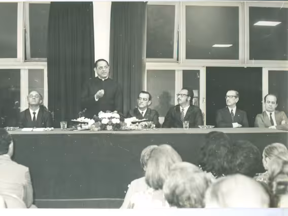 Formatura do curso de Relações Públicas. Mesa com o Reitor pe. Laércio S.J. e coordenadores do Curso.