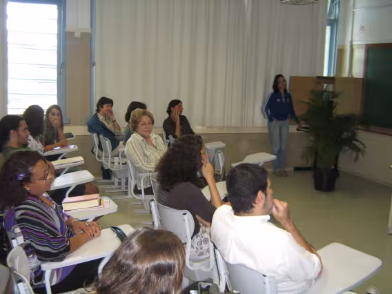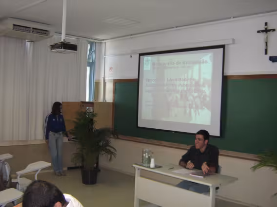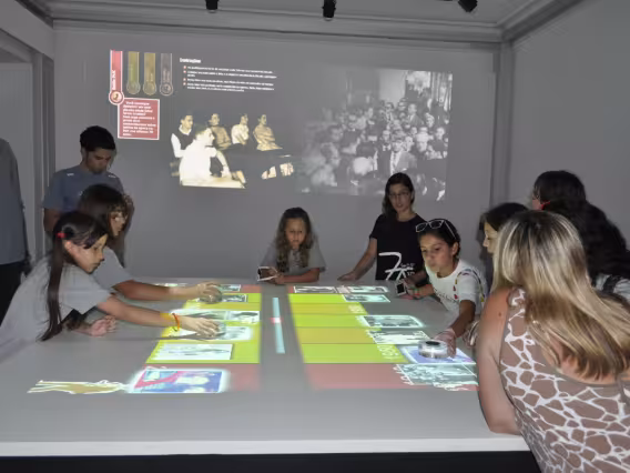 Alunos do Colégio Stockler interagem com mesa da sala Jogos da Memória.