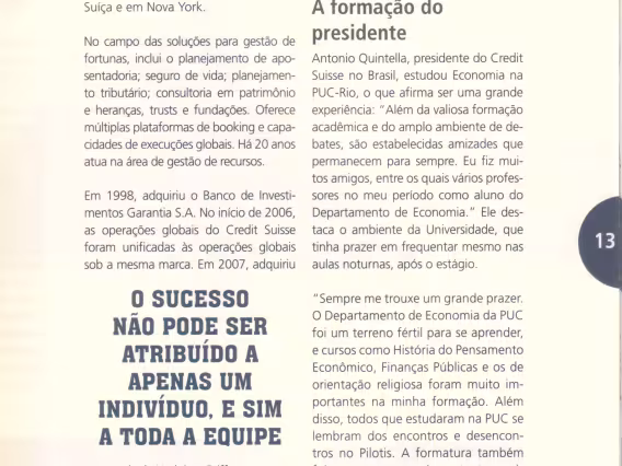 Código exclusivo pv0009_013 Coleção Revista PONTES #1 Data de criação 01/01/2009 Descrição Entrevista de Antonio Quintella, presidente da Credit Suisse no Brasil, à Revista PONTES, n°1 (página 13)