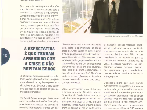 Código exclusivo pv0009_016 Coleção Revista PONTES #1 Data de criação 01/01/2009 Descrição Entrevista de Antonio Quintella, presidente da Credit Suisse no Brasil, à Revista PONTES, n°1 (página 16)