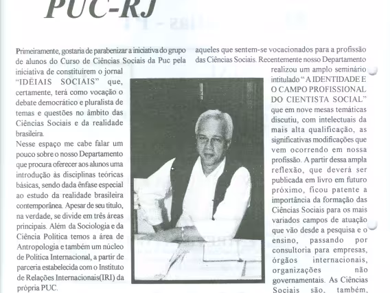 Página 02, primeira edição do jornal, ano 1, num. 1, Julho/1998. Texto "O Departamento de Sociologia e Política da PUC-RJ", assinado pelo então diretor, Prof. Eduardo Raposo. Foto de Eduardo Raposo.