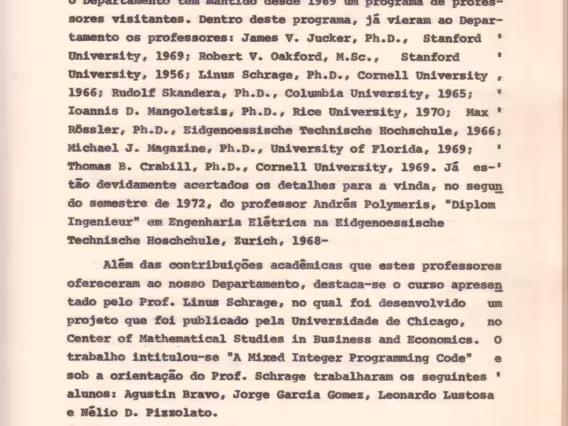Código exclusivo cg0017_027 Coleção Credenciamento do Curso de Mestrado em Engenharia Industrial (Produção) no Conselho Federal de Educação - 1973 Data de criação 01/01/1973 Descrição Página 31. Professores visitantes que já participaram do programa, de 1969 até 1972.