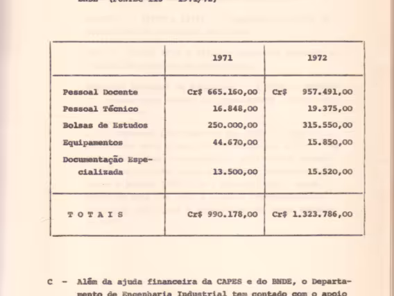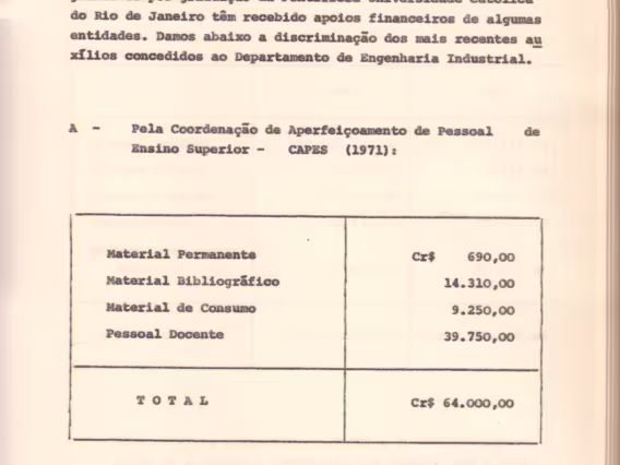 Página 25. Capacidade financeira para manutenção do curso. Contém tabela na qual consta o apoio financeiro concedido pelo BNDE, em cruzeiro, e inicia lista com outras instituições que concedem ajuda financeira ao Departamento de Engenharia Industrial.