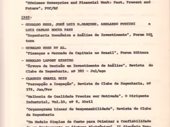 Código exclusivo cg0017_012 Coleção Credenciamento do Curso de Mestrado em Engenharia Industrial (Produção) no Conselho Federal de Educação - 1973 Data de criação 01/01/1973 Descrição Página 16. Relação das publicações do corpo docente, ano a ano, desde 1968.