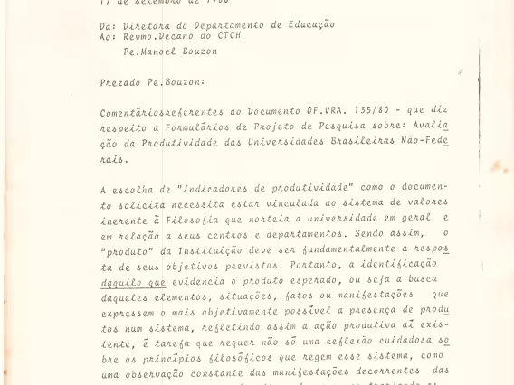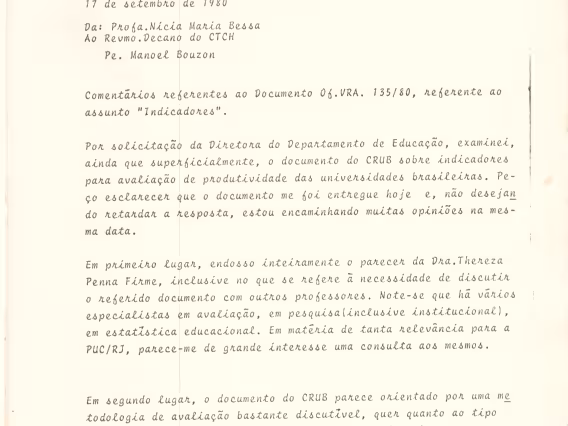 Código exclusivo cg0040_010 Coleção Pesquisa Institucional do Conselho de Reitores das Universidades Brasileiras - CRUB Data de criação 01/01/1980 Descrição Comentários referentes ao Documento OF.VRA.135/80, pela Profa.Thereza (?), 17/09/1980