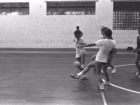 Código exclusivo ak0013_054 Coleção Acervo do professor Alfredo Jefferson relacionado à eventos na PUC-Rio Data de criação 01/01/1979 Natureza do documento imagem Tipo de documento negativo PB Descrição Alunas jogam futebol de salão.