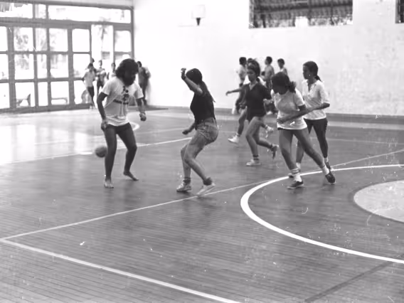 Código exclusivo ak0013_050 Coleção Acervo do professor Alfredo Jefferson relacionado à eventos na PUC-Rio Data de criação 01/01/1979 Natureza do documento imagem Tipo de documento negativo PB Descrição Alunas jogam futebol de salão.