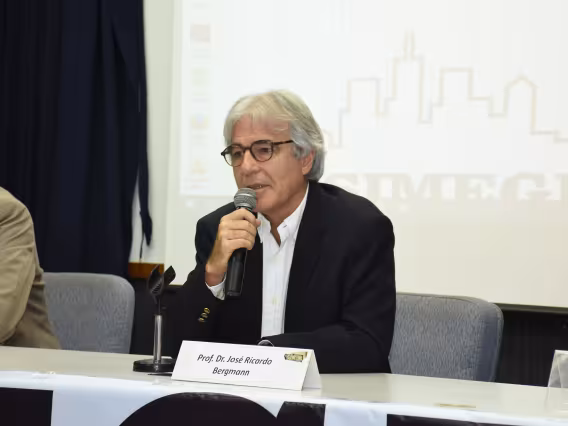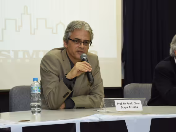 O prof. Paulo César Duque Estrada participa da mesa de abertura do simpósio.