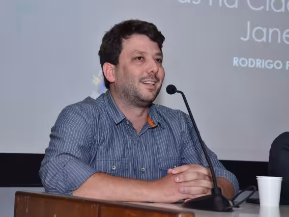 O professor Marcelo Motta de Freitas, do Departamento de Geografia, na palestra sobre chuvas na cidade do Rio de Janeiro.