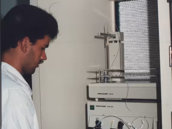 Pessoa opera equipamentos em laboratório. Equipamento Perkin Elmer AS-90 Autosampler e equipamento Perkin Elmer FIAS 200.