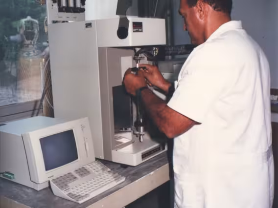Pessoa opera equipamento em laboratório com apoio de microcomputador. Máquina de teste Instron Model 1125 utilizada para a realização de testes de tração.