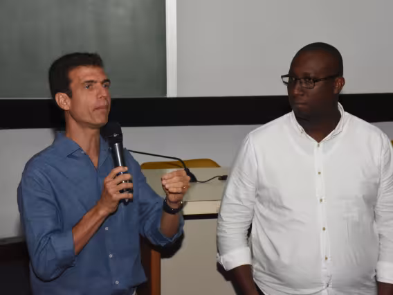 Mesa com autoridades presentes na visita do candidato à Presidência da República, Tancredo Neves, à PUC-Rio.