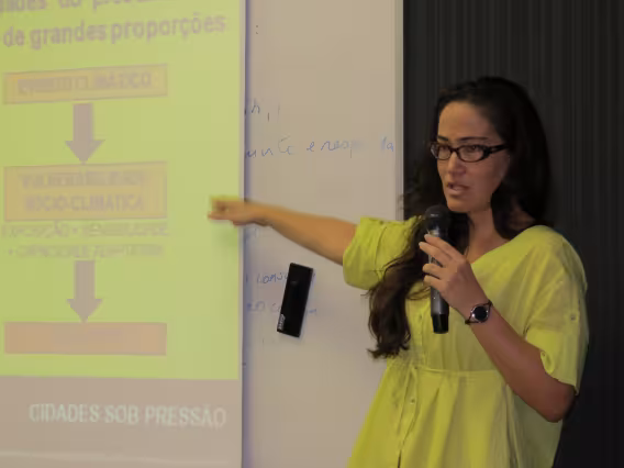 Platéia assiste a palestra da Profa. Maria Fernanda Lemos (DAU).