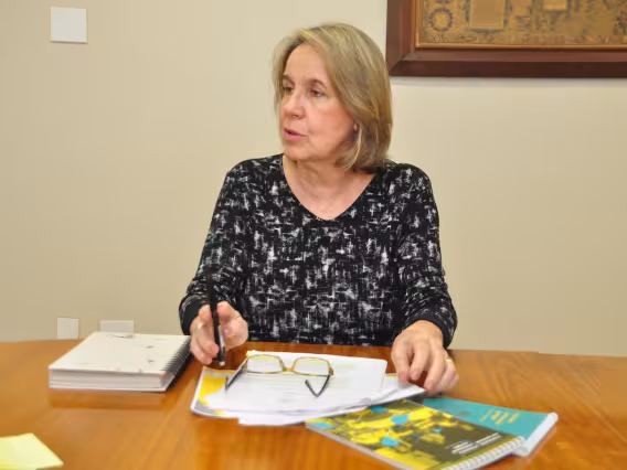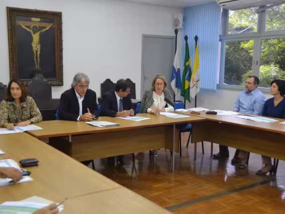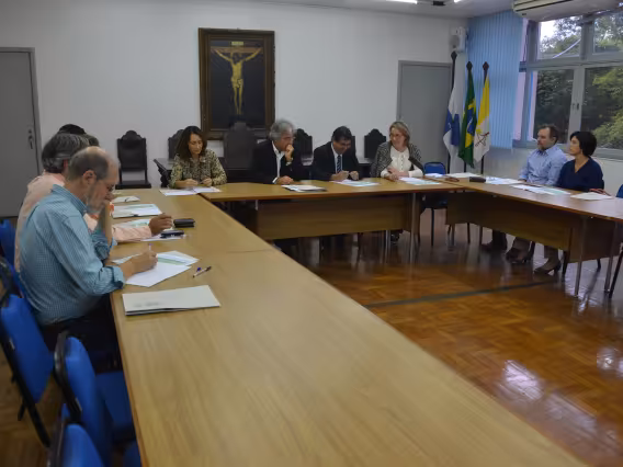 Encontro de professores e pesquisadores na Sala do Conselho Universitário.