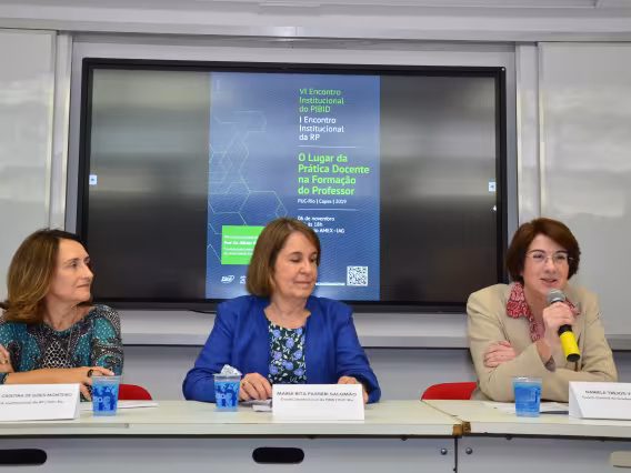 A Coordenadora Institucional do Programa de Residência Pedagógica da PUC-Rio, profa. Maria Cristina de Góes Monteiro, a Coordenadora Institucional do PIBID, profa. Maria Rita Passeri Salomão, e a Coordenadora Central de Graduação, profa. Daniela Vargas, participam do VI Encontro Institucional do PIBID e do I Encontro do Programa de Residência Pedagógica.