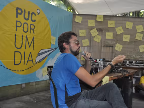Estudantes no evento PUC por um Dia, próximos ao antigo espaço das araras.