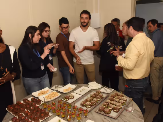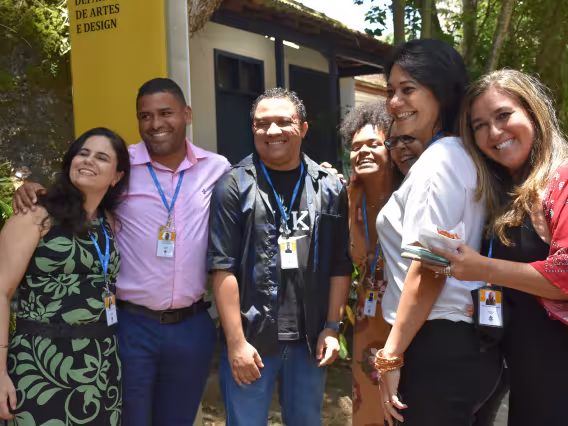 Assembleia de greve dos funcionários da PUC-Rio. Funcionários de mãos dadas e braços elevados. A greve chegou a ser decretada, mas negociações em dias posteriores levaram a um acordo e a greve foi cancelada.