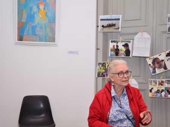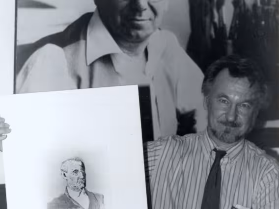 O professor João Candido segura a gravura O Retrato do Sr. Baptista, em homenagem a seu avô Giovan Battista Portinari. Ao fundo, uma fotografia do seu pai, o pintor Candido Portinari, com seus pinceis de trabalho.