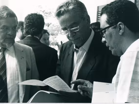O professor padre Josafá S.J. apresenta o projeto das hortas comunitárias ao então prefeito do Rio de Janeiro Marcello Alencar.