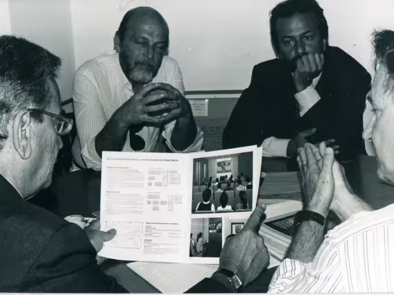 O prefeito Marcello Alencar folheia o informativo sobre museus durante a reunião com o prof. João Candido e o secretário municipal de Cultura Carlos Eduardo Novaes.