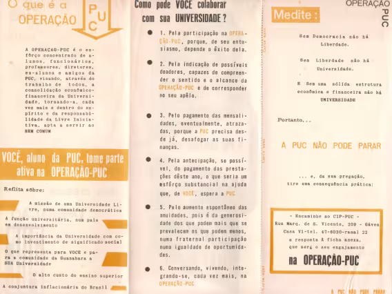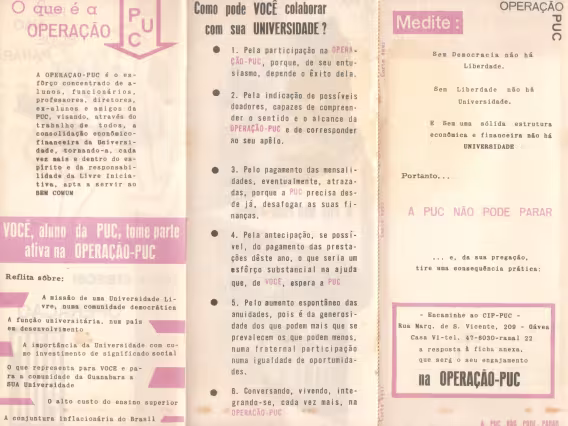 Parte interna do folder da Campanha Financeira da PUC-Rio, denominada neste ano de "Operação-PUC". Convoca os alunos a participarem do esforço financeiro da Universidade, por conta da "conjuntura inflacionária" e através da "indicação de possíveis doadores", pelo pagamento das mensalidades atrasadas, pela "antecipação, se possível, do pagamento das prestações deste ano" e "Pelo aumento espontâneo das anuidades, pois é da generosidade dos que podem mais que se prevalecem os que podem menos".