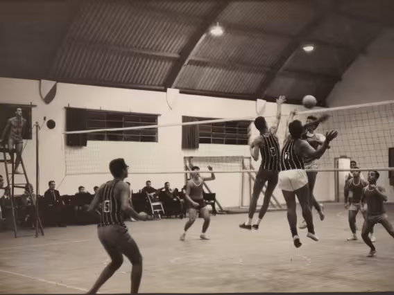 Encerramento do ano letivo do Colégio Teresiano, com atividade esportiva no Ginásio Esportivo da PUC-Rio. As instalações do Teresiano ainda deviam estar em obras.