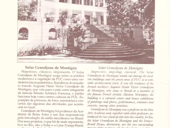 Exposição sobre a obra de Grandjean de Montigny, em particular o Solar, com imagens dos projetos de Grandjean, realizados na cidade do Rio de Janeiro ou apenas projetados, e imagens de trabalhos de outros membros da Missão Francesa. Parte da programação da Conferência Rio-92.