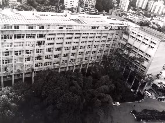 Foto aérea do bairro da Gávea. Em destaque o campus da PUC-Rio e o Conjunto Residencial Marquês de São Vicente.