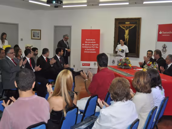 O reitor Padre Josafá fala na cerimônia de assinatura do convênio de apoio à Agenda Ambiental PUC-Rio e Santander Universidades. À mesa, além dos representantes da PUC-Rio, estão Jamil Hannouche, vice-presidente, e Afrânio Pereira, superintendete do Grupo Santander Universidades.
