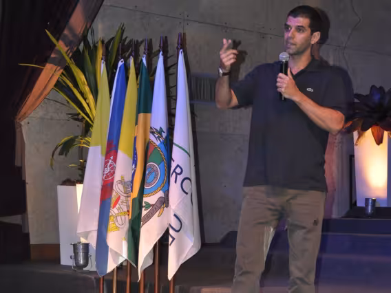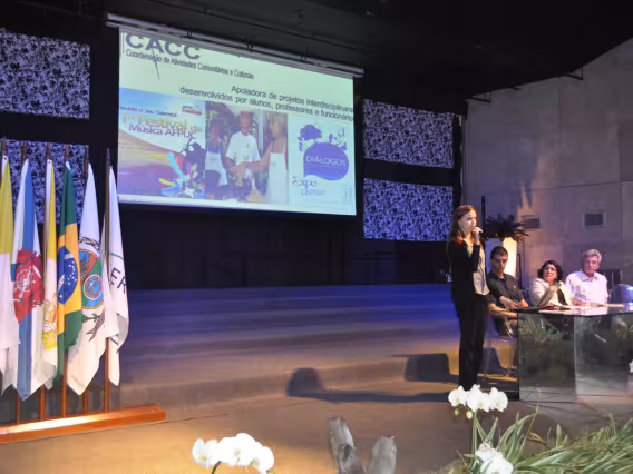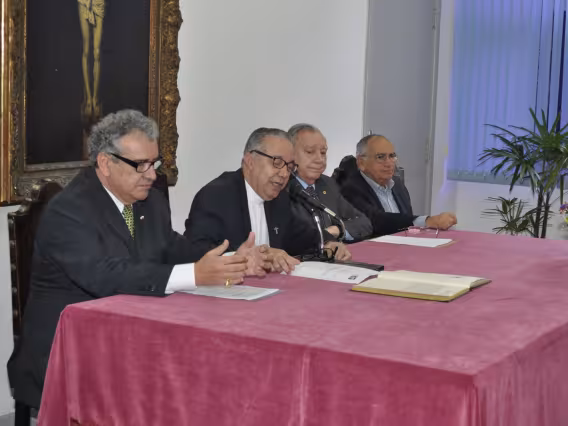 O reitor Padre Josafá dá início à cerimônia de posse do Professor Sérgio Bruni no cargo de Vice-reitor para Assuntos de Desenvolvimento, substituindo o Padre Ivern, também presente à mesa.