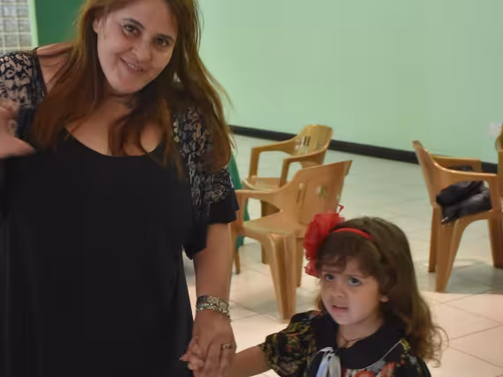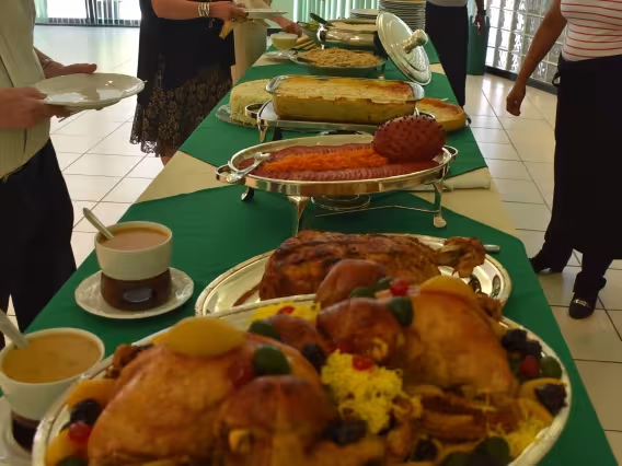 Mesas com funcionários na confraternização.