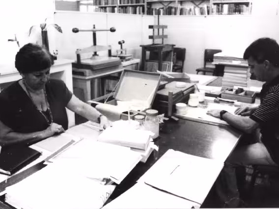 Funcionários Lúcia e Edison no setor de restauração da Biblioteca Central da PUC-Rio.