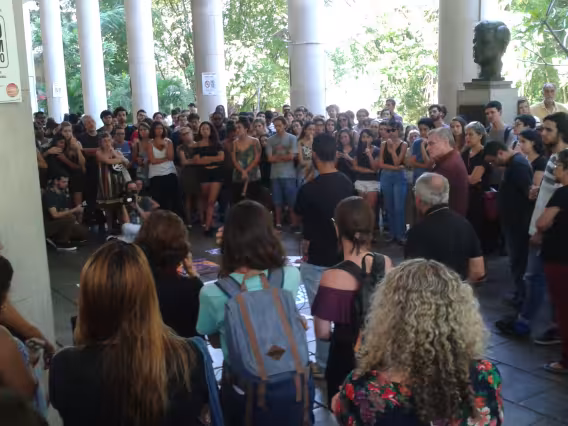 Manifestação nos pilotis com a participação de alunos, professores e funcionários.